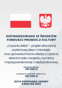 Informujemy, że nasza Fundacja otrzymała dofinansowanie ze środków Ministra Kultury i Dziedzictwa Narodowego pochodzących z Funduszu Promocji Kultury w kwocie 210 000,00 zł. na realizację zadania pn. „Czytanie zbliża” – projekt aktywizacji czytelniczej dzieci i młodzieży oraz upowszechniania wiedzy o czytaniu dzieciom jako narzędziu wymiany międzypokoleniowej i międzykulturowej.